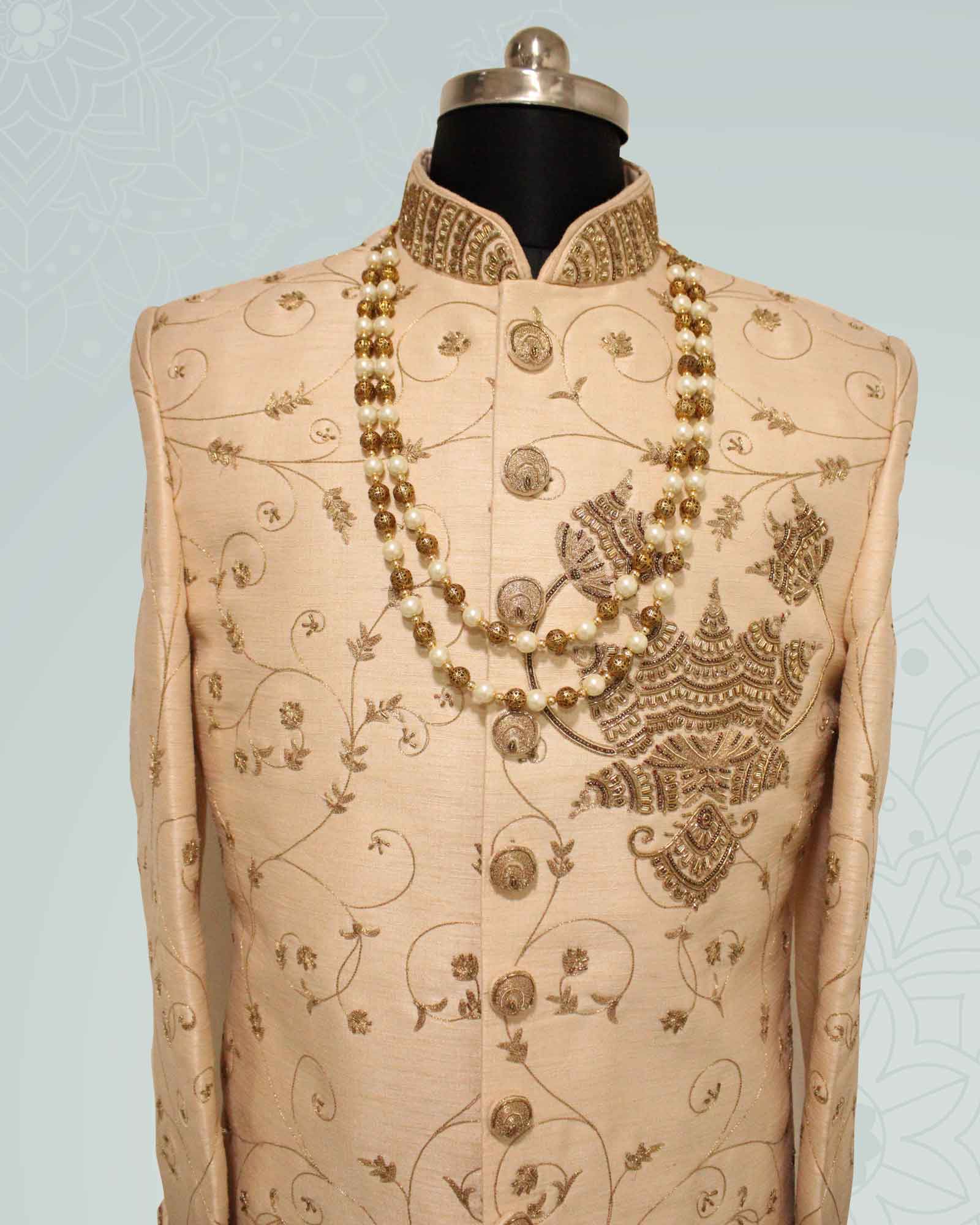 Groom wedding fan design on turban in velvet. Make features with zari weaving at over all, kilangi and heavy zardosi,pearl work lace details.