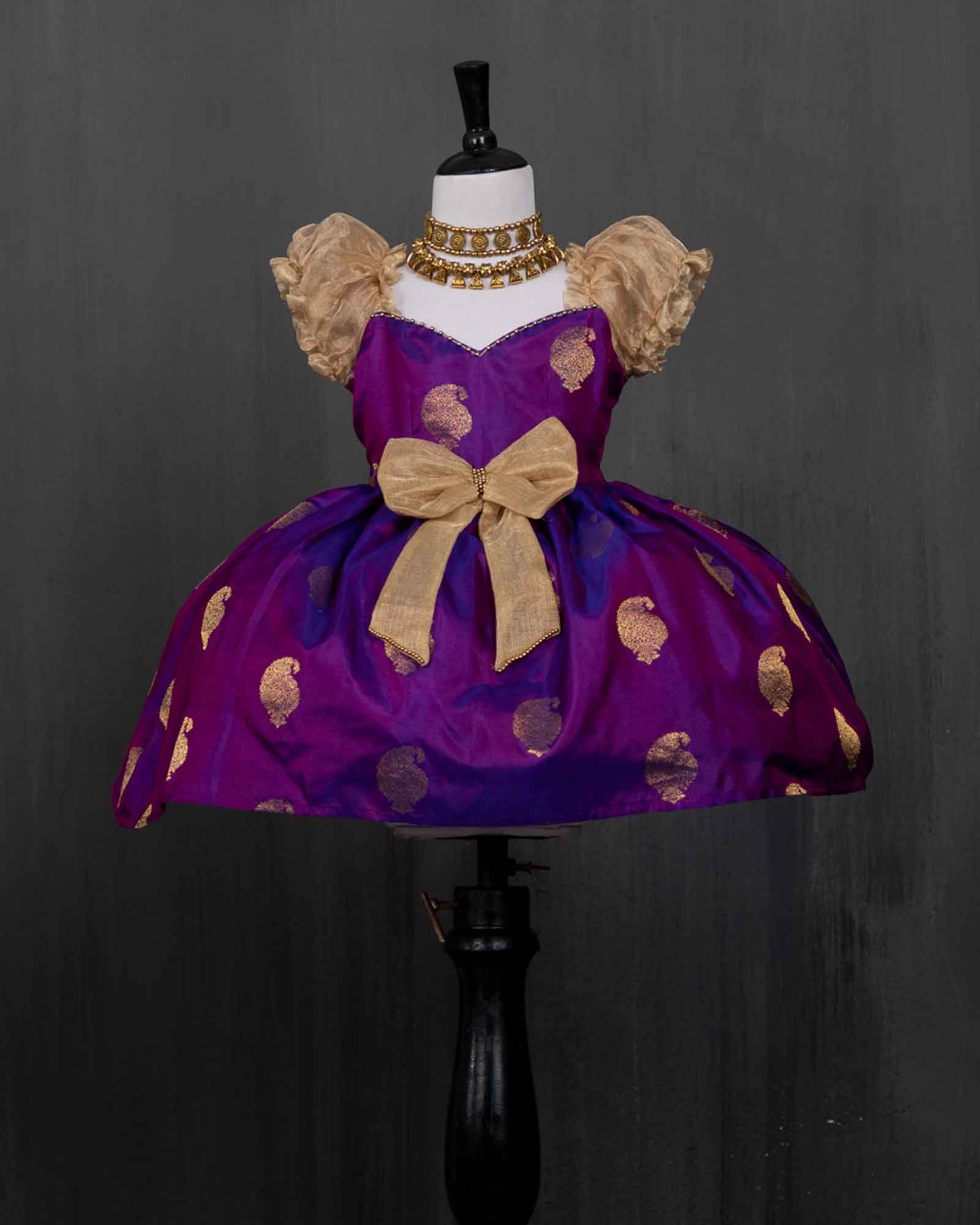 This gown is such a lovely option for birthdays, weddings and ceremonies. This gown is cut from the elegant Kanchipuram silk has mango motifs in gold zari. The puff sleeves and bow are made in lustrous gold tissue.