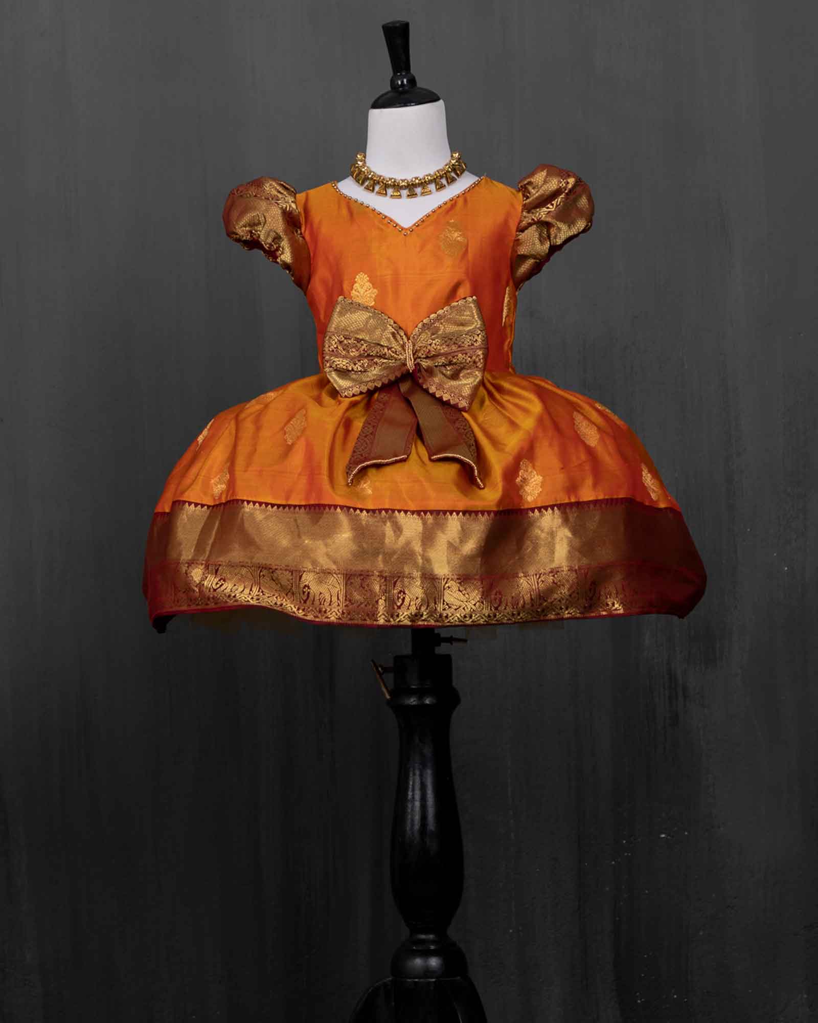 If you are looking for a gown that gets your baby girl noticed, this exquisite gowns have been designed to meet your needs. Precisely cut from the elegant Kanchipuram silk is woven with traditional motifs in gold zari. The gown has a gold beaded heart cut back, and features the border tied into a bow at the back.