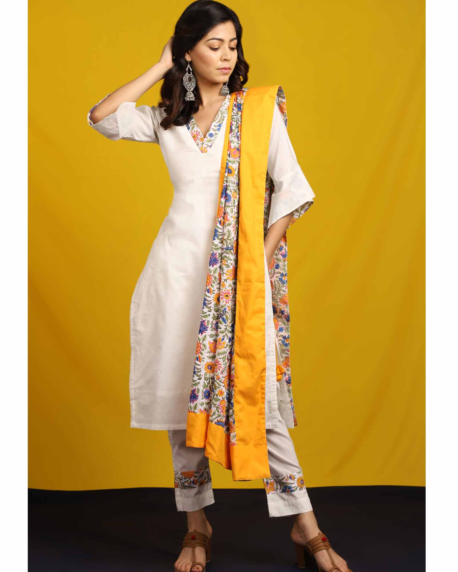 This set includes circular suit set with handwork on on choli with chudidar sleeves paired with kota Grey Doriya Dupatta.