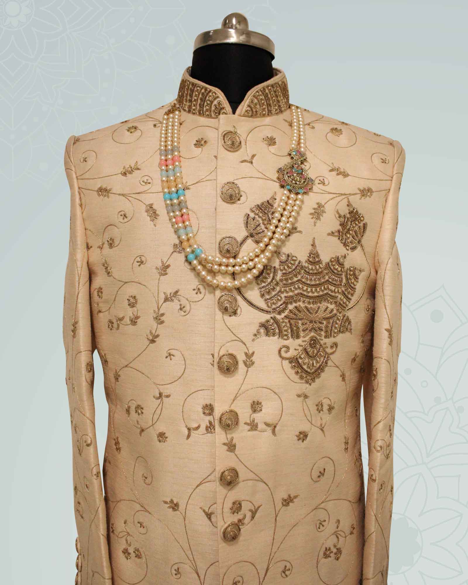 Look dope in your ethnic attire by wearing this Urbane Zardosi Work Indowestern. The coat is highlighted with metal buttons and Asymmetric Hem. Indo Western is teamed Golden Peshawari.