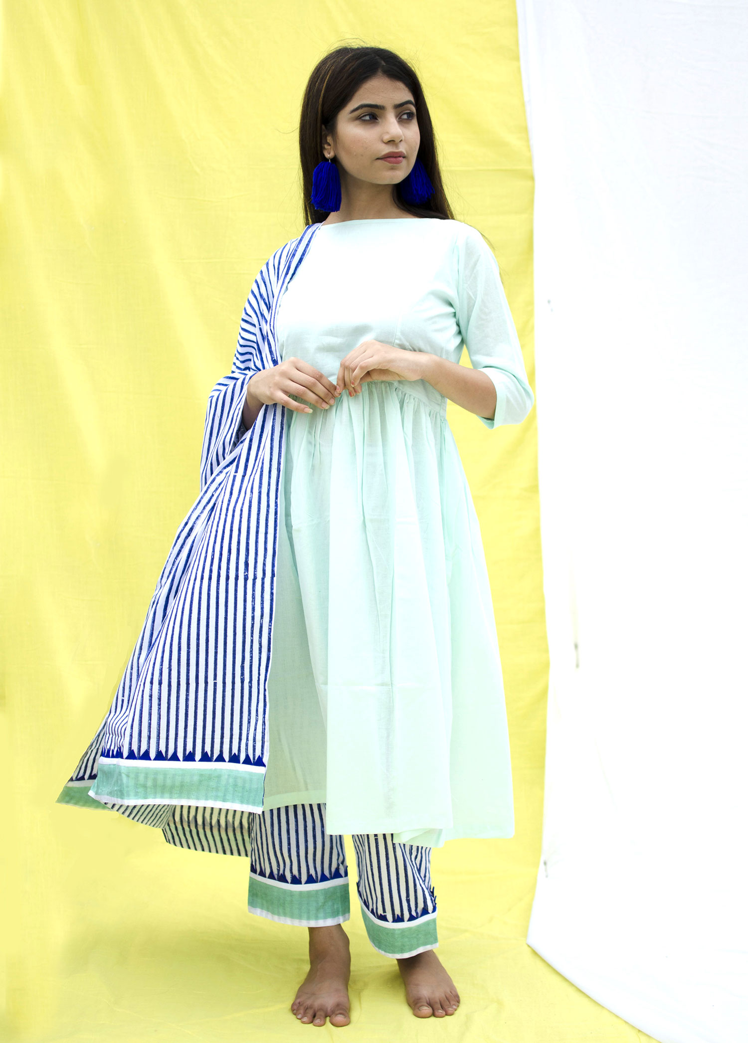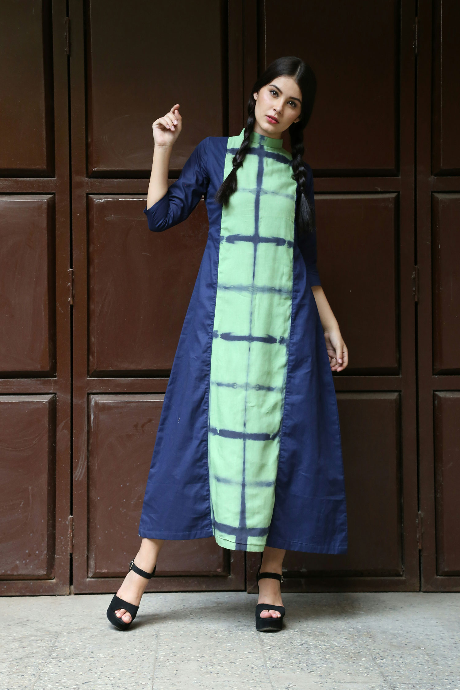 This is a cold shoulder midi dress in cotton. It has solid blue ruffles at the hemline to add volume to this A-Line dress. It has elasticated sleeves to keep them in place. There might be a slight change in color and pattern since all of them are individually tie-dye especially for you. Only dry clean the garment. Just pair them up with those in-trend white sneakers of yours and this slip on the dress will make your day.